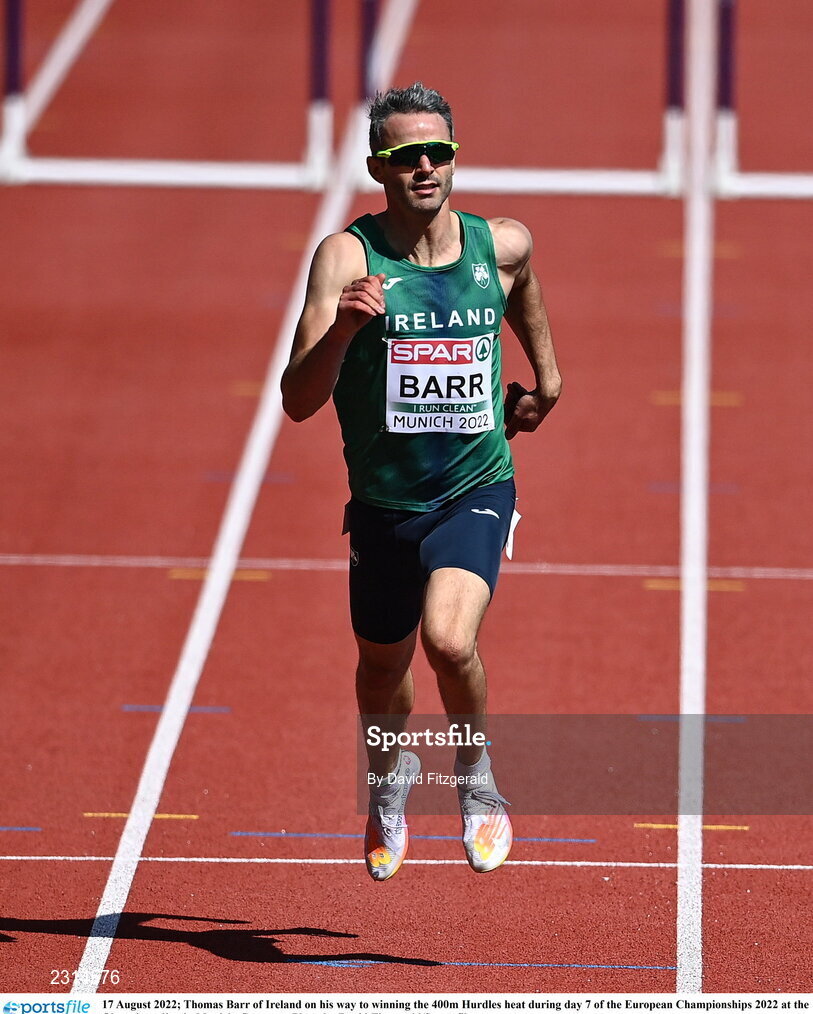 17 August 2022; Thomas Barr of Ireland on his way to winning the 400m Hurdles heat during day 7 of the European Championships 2022 at the Olympiastadion in Munich, Germany. Photo by David Fitzgerald/Sportsfile