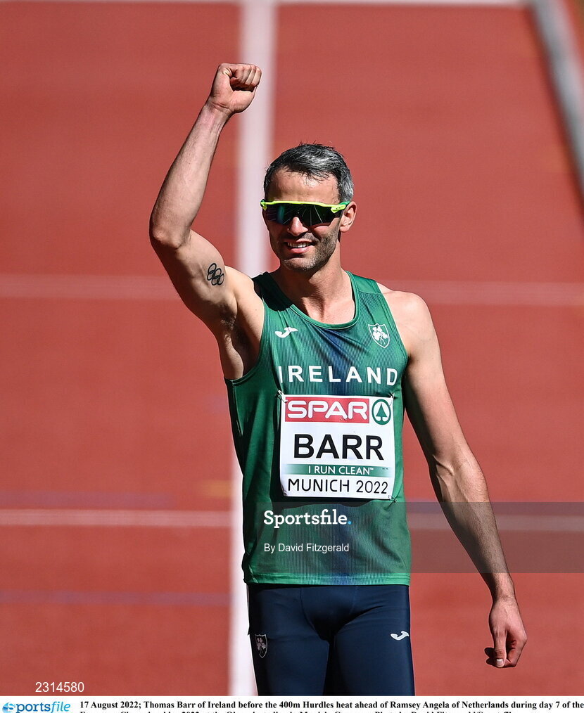 17 August 2022; Thomas Barr of Ireland before the 400m Hurdles heat ahead of Ramsey Angela of Netherlands during day 7 of the European Championships 2022 at the Olympiastadion in Munich, Germany. Photo by David Fitzgerald/Sportsfile