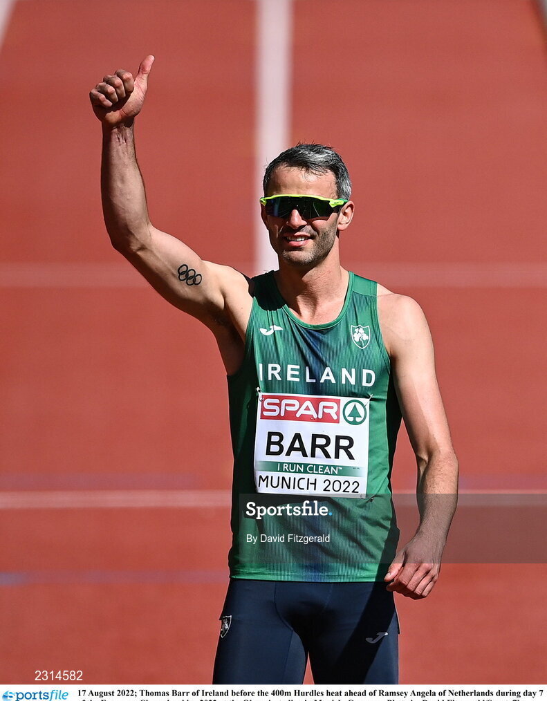17 August 2022; Thomas Barr of Ireland before the 400m Hurdles heat ahead of Ramsey Angela of Netherlands during day 7 of the European Championships 2022 at the Olympiastadion in Munich, Germany. Photo by David Fitzgerald/Sportsfile