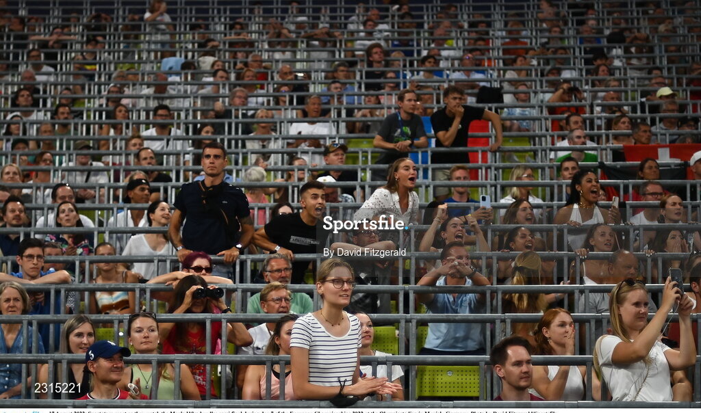 17 August 2022; Spectators react as they watch the Men's 110m hurdles semi final during day 7 of the European Championships 2022 at the Olympiastadion in Munich, Germany. Photo by David Fitzgerald/Sportsfile
