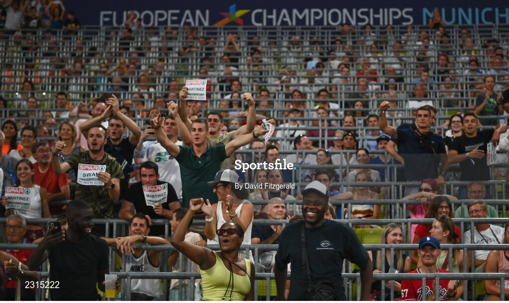 17 August 2022; Spectators react as they watch the Men's 110m hurdles semi final during day 7 of the European Championships 2022 at the Olympiastadion in Munich, Germany. Photo by David Fitzgerald/Sportsfile