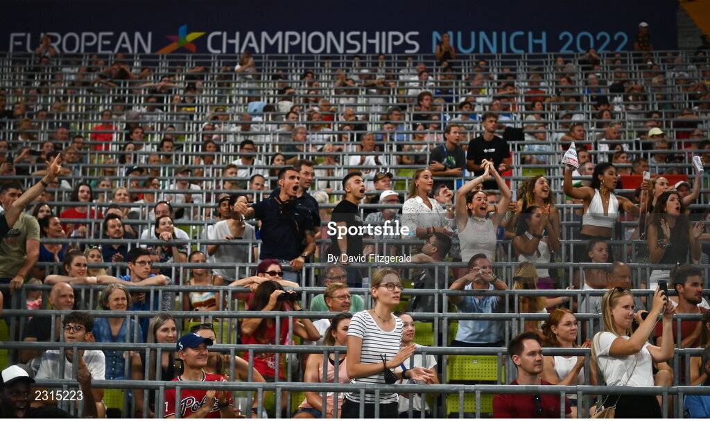 17 August 2022; Spectators react as they watch the Men's 110m hurdles semi final during day 7 of the European Championships 2022 at the Olympiastadion in Munich, Germany. Photo by David Fitzgerald/Sportsfile