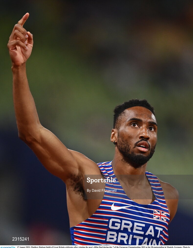 17 August 2022; Matthew Hudson-Smith of Great Britain celebrates after winning the men's 400m final during day 7 of the European Championships 2022 at the Olympiastadion in Munich, Germany. Photo by David Fitzgerald/Sportsfile