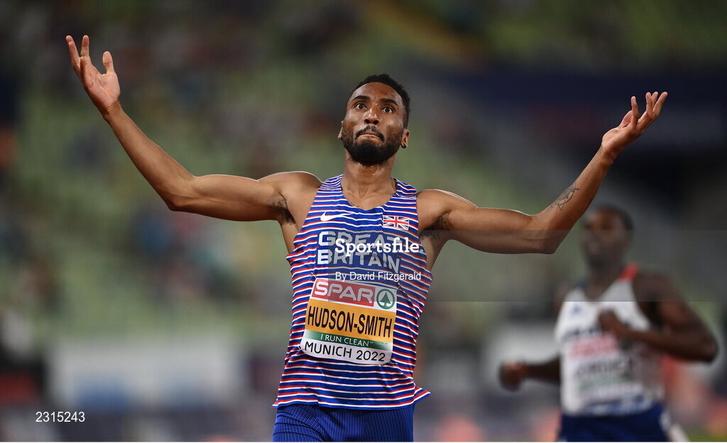 17 August 2022; Matthew Hudson-Smith of Great Britain celebrates after winning the men's 400m final during day 7 of the European Championships 2022 at the Olympiastadion in Munich, Germany. Photo by David Fitzgerald/Sportsfile