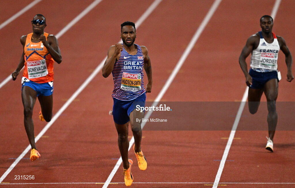 17 August 2022; Matthew Hudson-Smith of Great Britain, centre, on his way to winning the men's 400m final during day 7 of the European Championships 2022 at the Olympiastadion in Munich, Germany. Photo by Ben McShane/Sportsfile