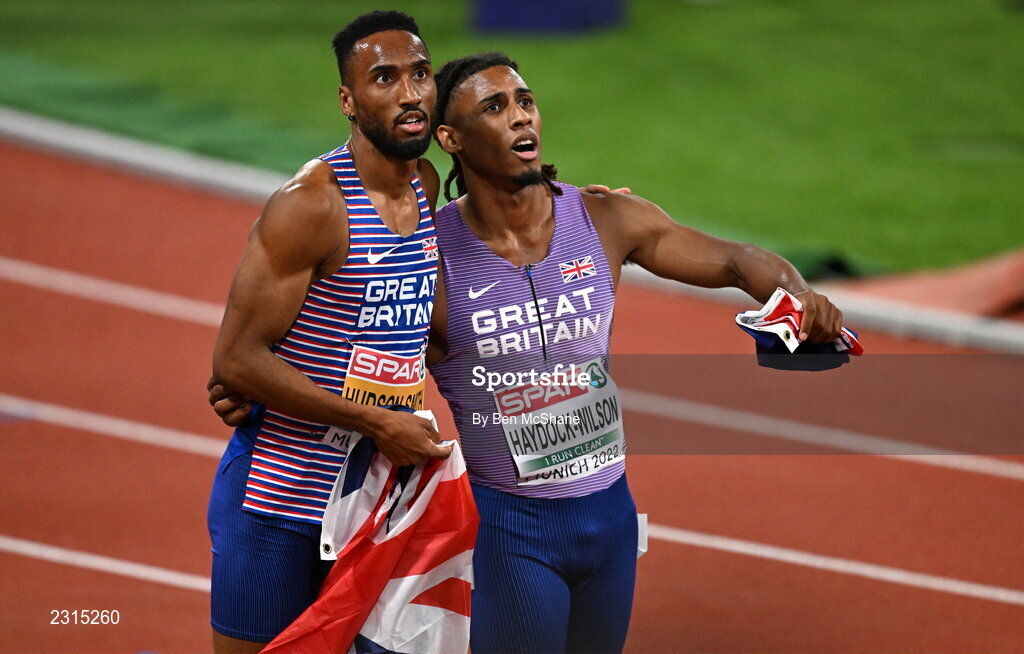 17 August 2022; Matthew Hudson-Smith of Great Britain, left, celebrates winning the men's 400m final with team-mate Alex Haydock-Wilson, who finished third, during day 7 of the European Championships 2022 at the Olympiastadion in Munich, Germany. Photo by Ben McShane/Sportsfile