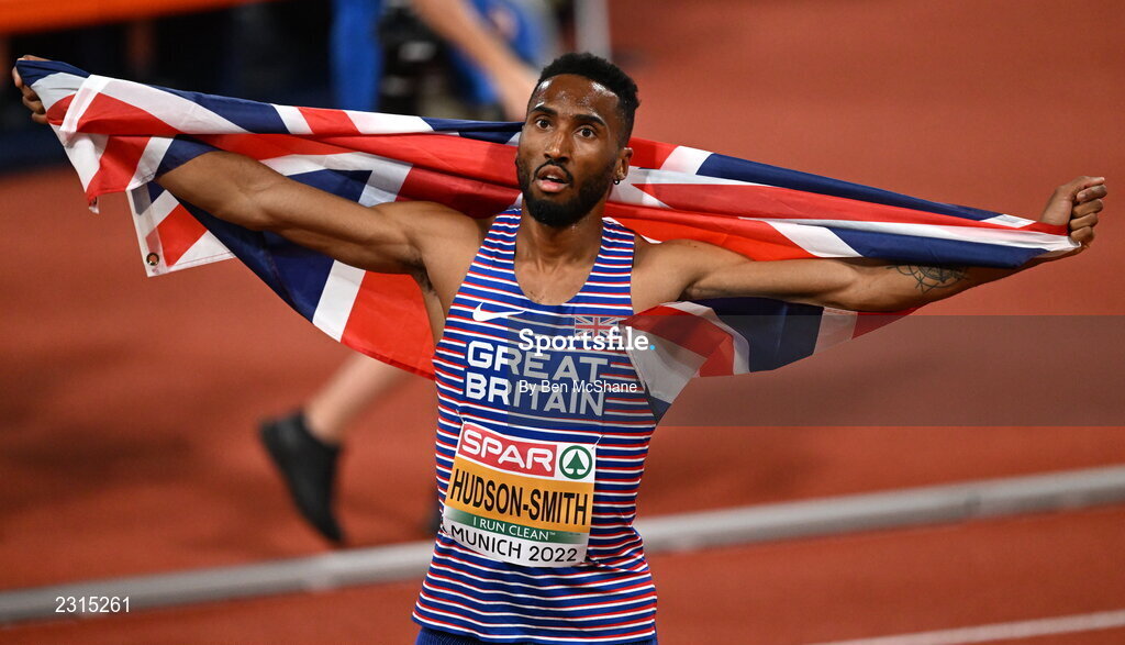 17 August 2022; Matthew Hudson-Smith of Great Britain, celebrates after winning the men's 400m final during day 7 of the European Championships 2022 at the Olympiastadion in Munich, Germany. Photo by Ben McShane/Sportsfile
