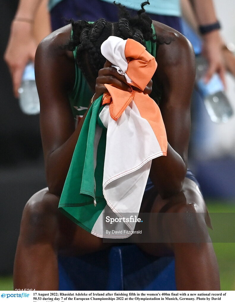 17 August 2022; Rhasidat Adeleke of Ireland after finishing fifth in the women's 400m final with a new national record of 50.53 during day 7 of the European Championships 2022 at the Olympiastadion in Munich, Germany. Photo by David Fitzgerald/Sportsfile