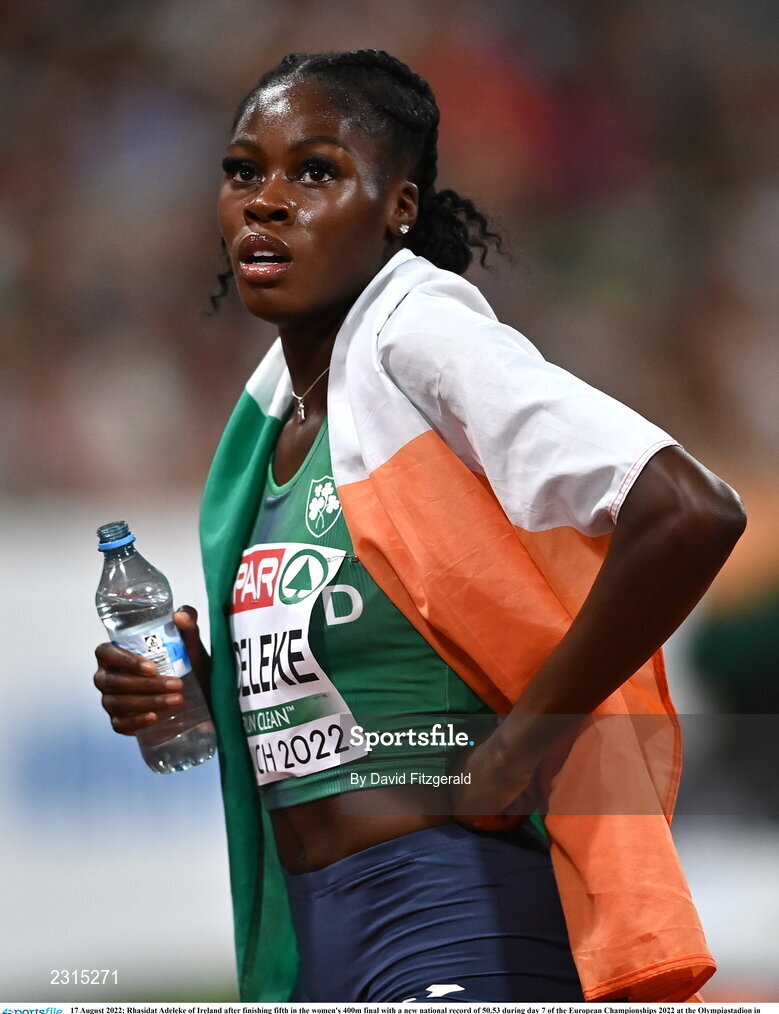 17 August 2022; Rhasidat Adeleke of Ireland after finishing fifth in the women's 400m final with a new national record of 50.53 during day 7 of the European Championships 2022 at the Olympiastadion in Munich, Germany. Photo by David Fitzgerald/Sportsfile