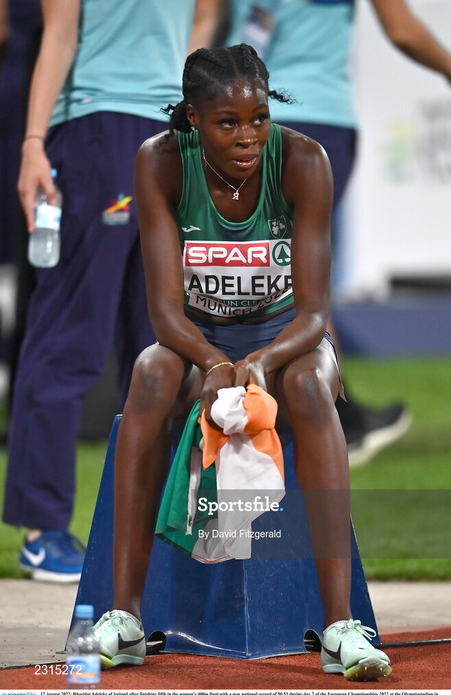 17 August 2022; Rhasidat Adeleke of Ireland after finishing fifth in the women's 400m final with a new national record of 50.53 during day 7 of the European Championships 2022 at the Olympiastadion in Munich, Germany. Photo by David Fitzgerald/Sportsfile