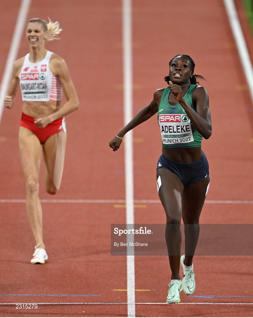 17 August 2022; Rhasidat Adeleke of Ireland, right, on her way to finishing fifth in the women's 400m final with a new national record of 50.53 during day 7 of the European Championships 2022 at the Olympiastadion in Munich, Germany. Photo by Ben McShane/Sportsfile