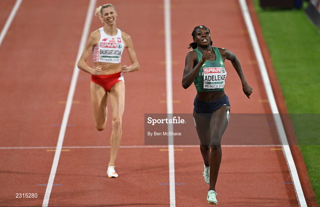 17 August 2022; Rhasidat Adeleke of Ireland, right, on her way to finishing fifth in the women's 400m final with a new national record of 50.53 during day 7 of the European Championships 2022 at the Olympiastadion in Munich, Germany. Photo by Ben McShane/Sportsfile