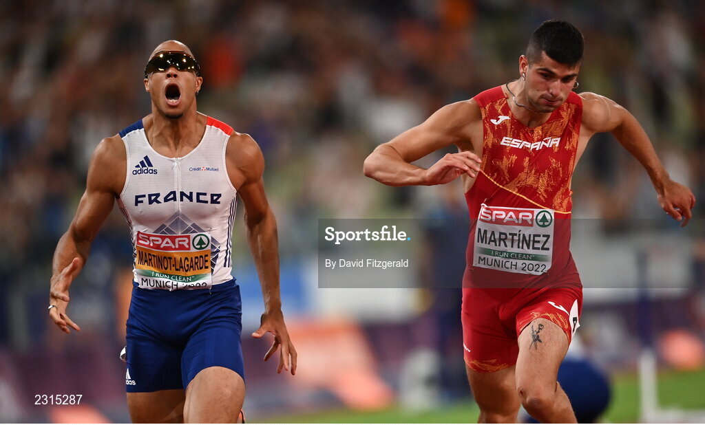17 August 2022; Pascal Martinot-Lagarde of France, left, celebrates as he crosses the line in second place beside winner Asier Martinez in the Men's 110m hurdles final during day 7 of the European Championships 2022 at the Olympiastadion in Munich, Germany. Photo by David Fitzgerald/Sportsfile