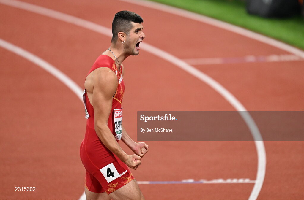 17 August 2022; Asier Martinez of Spain celebrates after winning the Men's 110m Hurdles during day 7 of the European Championships 2022 at the Olympiastadion in Munich, Germany. Photo by Ben McShane/Sportsfile