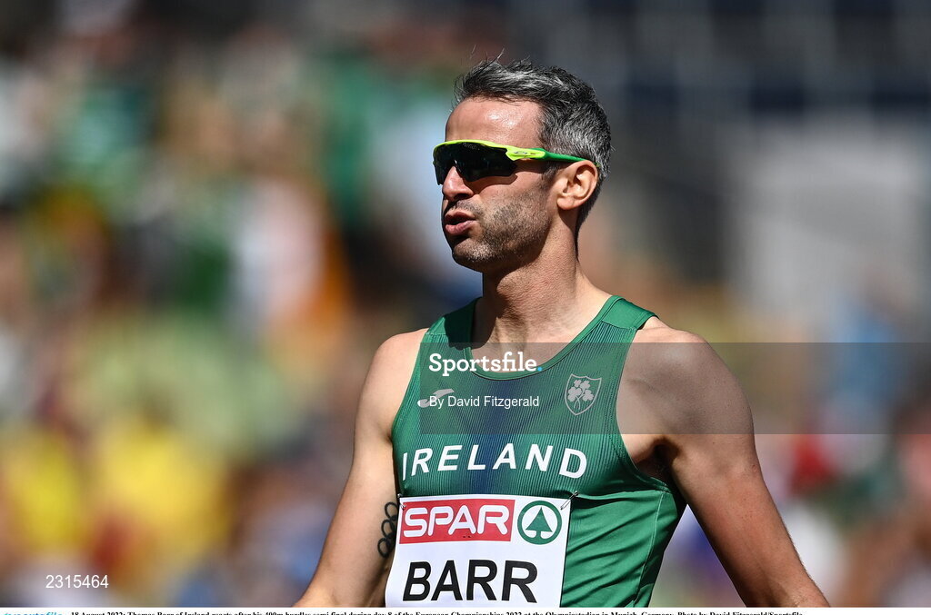 18 August 2022; Thomas Barr of Ireland reacts after his 400m hurdles semi final during day 8 of the European Championships 2022 at the Olympiastadion in Munich, Germany. Photo by David Fitzgerald/Sportsfile