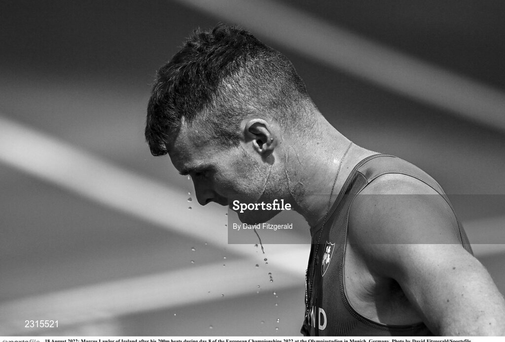 18 August 2022; (EDITORS NOTE: Image has been converted to black and white) Marcus Lawlor of Ireland after his 200m heats during day 8 of the European Championships 2022 at the Olympiastadion in Munich, Germany. Photo by David Fitzgerald/Sportsfile