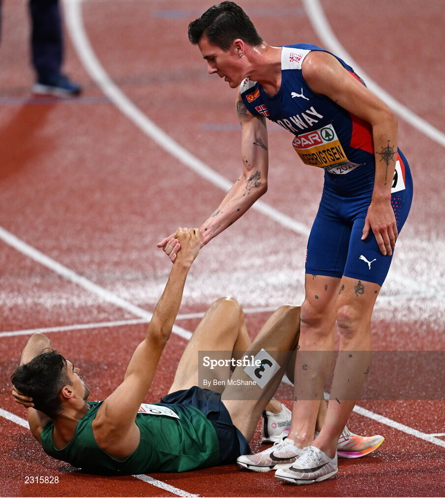18 August 2022; Jakob Ingebrigtsen of Norway helps Andrew Coscoran of Ireland to his feet after the Men's 1500m Final during day 8 of the European Championships 2022 at the Olympiastadion in Munich, Germany. Photo by Ben McShane/Sportsfile