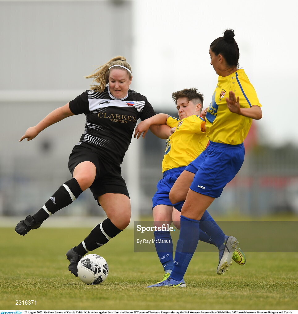 20 August 2022; Gráinne Barrett of Corrib Celtic FC in action against Jess Hunt and Emma O'Connor of Terenure Rangers during the FAI Women's Intermediate Shield Final 2022 match between Terenure Rangers and Corrib Celtic FC at Leah Victoria Park in Tullamore, Offaly. Photo by Ray McManus/Sportsfile