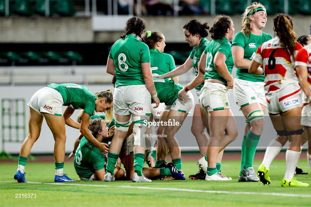 20 August 2022; Aoife Dalton of Ireland is congratulated by teammates after scoring their side's third try during the Women's Rugby Summer Tour match between Japan and Ireland at Ecopa Stadium in Shizouka, Japan. Photo by Sportsfile