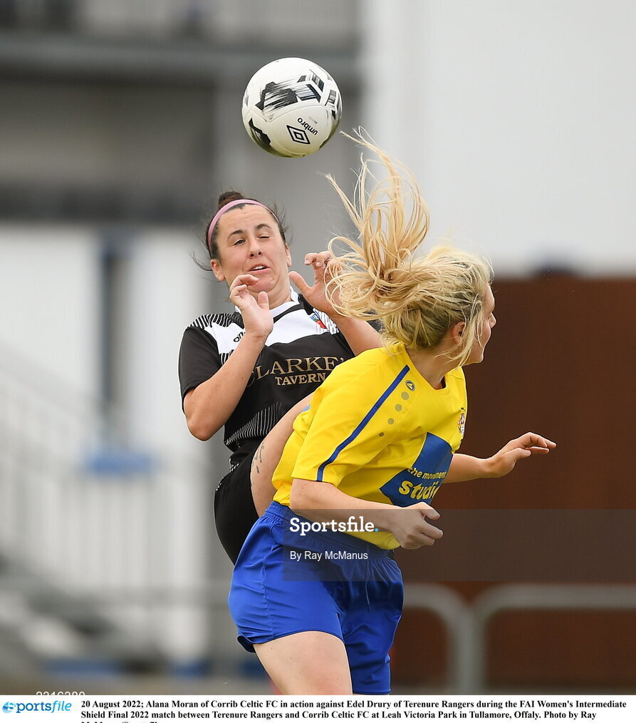 20 August 2022; Alana Moran of Corrib Celtic FC in action against Edel Drury of Terenure Rangers during the FAI Women's Intermediate Shield Final 2022 match between Terenure Rangers and Corrib Celtic FC at Leah Victoria Park in Tullamore, Offaly. Photo by Ray McManus/Sportsfile