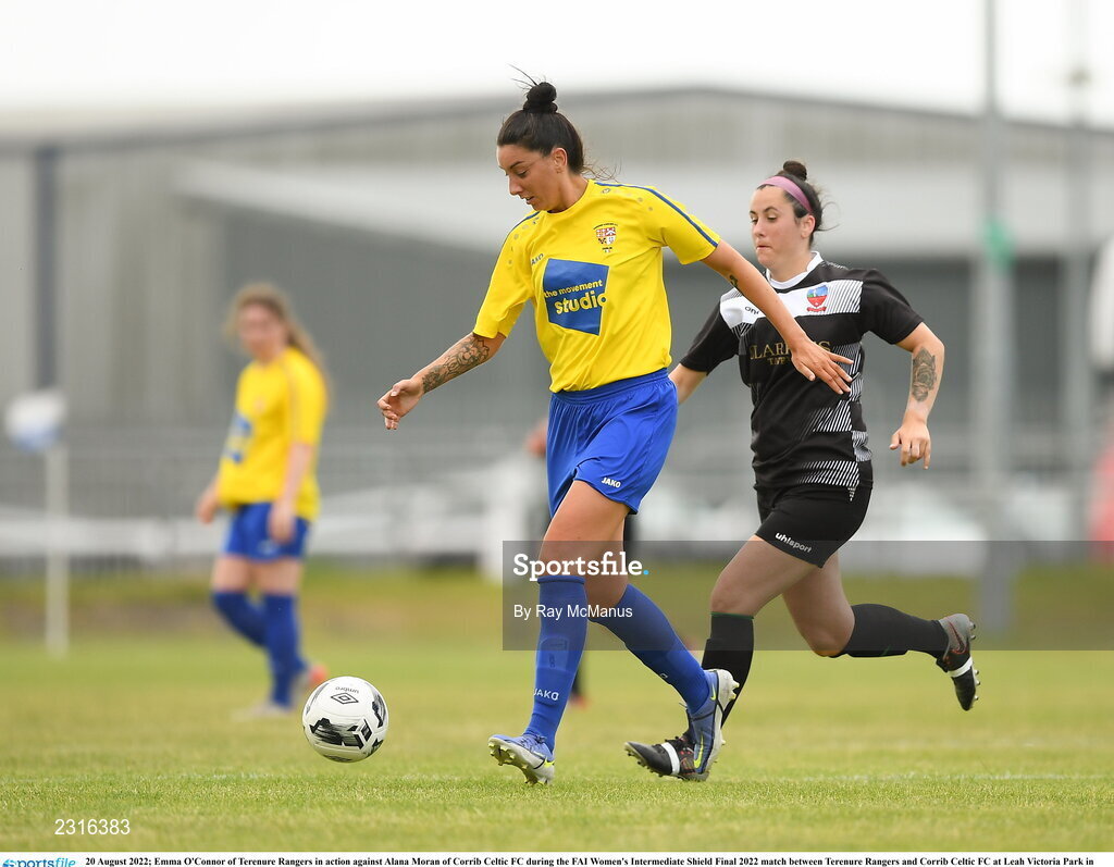 20 August 2022; Emma O'Connor of Terenure Rangers in action against Alana Moran of Corrib Celtic FC during the FAI Women's Intermediate Shield Final 2022 match between Terenure Rangers and Corrib Celtic FC at Leah Victoria Park in Tullamore, Offaly. Photo by Ray McManus/Sportsfile