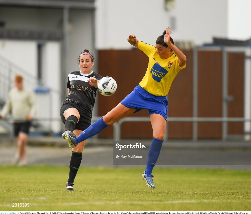 20 August 2022; Alana Moran of Corrib Celtic FC in action against Emma O'Connor of Terenure Rangers during the FAI Women's Intermediate Shield Final 2022 match between Terenure Rangers and Corrib Celtic FC at Leah Victoria Park in Tullamore, Offaly. Photo by Ray McManus/Sportsfile