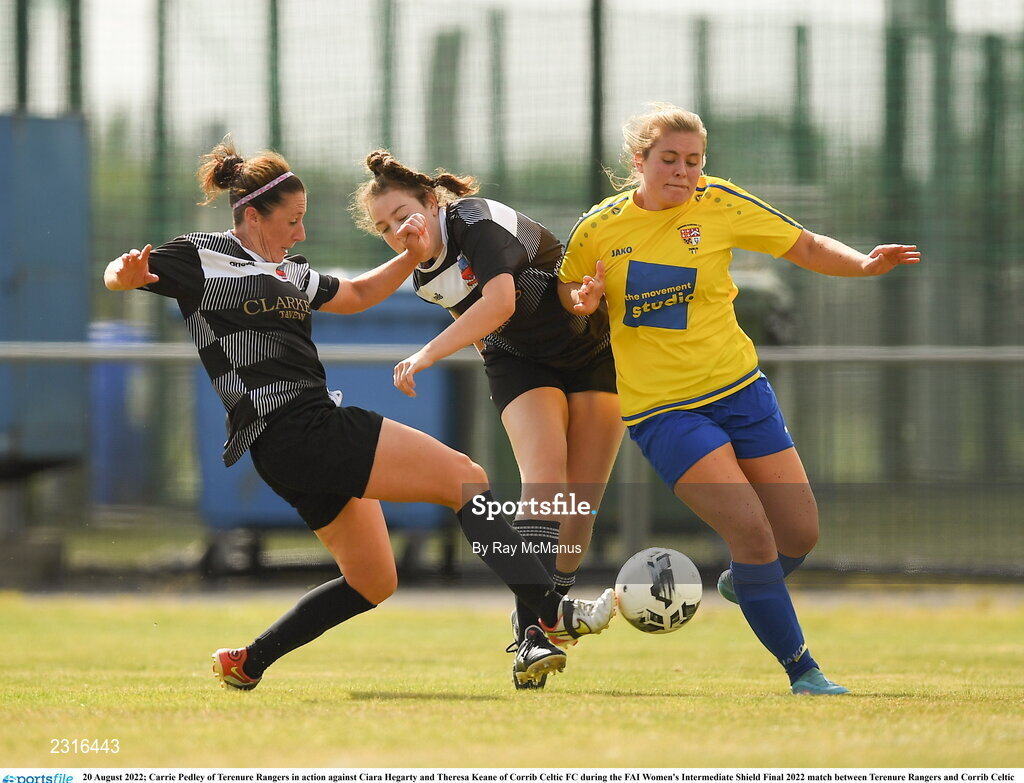20 August 2022; Carrie Pedley of Terenure Rangers in action against Ciara Hegarty and Theresa Keane of Corrib Celtic FC during the FAI Women's Intermediate Shield Final 2022 match between Terenure Rangers and Corrib Celtic FC at Leah Victoria Park in Tullamore, Offaly. Photo by Ray McManus/Sportsfile