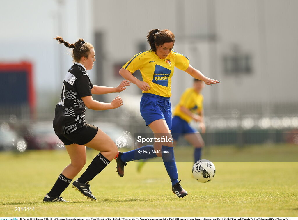 20 August 2022; Eimear O'Herlihy of Terenure Rangers in action against Ciara Hegarty of Corrib Celtic FC during the FAI Women's Intermediate Shield Final 2022 match between Terenure Rangers and Corrib Celtic FC at Leah Victoria Park in Tullamore, Offaly. Photo by Ray McManus/Sportsfile