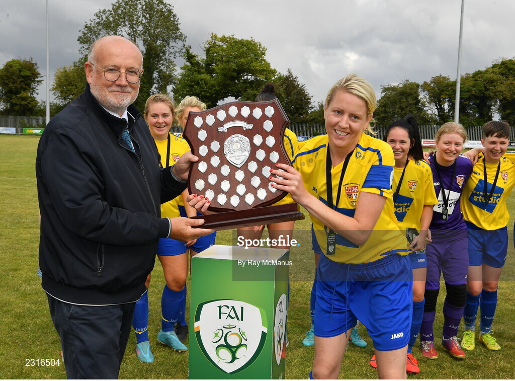 20 August 2022; Fran Gavin, FAI Data Registrations & Competitions Manager presents the Shield to Ruth Comerford of Terenure Rangers after the FAI Women's Intermediate Shield Final 2022 match between Terenure Rangers and Corrib Celtic FC at Leah Victoria Park in Tullamore, Offaly. Photo by Ray McManus/Sportsfile