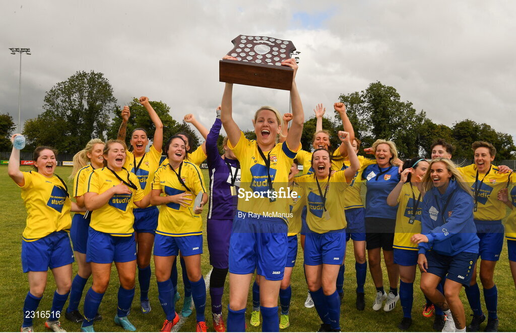 20 August 2022; The Terenure Rangers captain Ruth Comerford, and her team mates, celebrate after the FAI Women's Intermediate Shield Final 2022 match between Terenure Rangers and Corrib Celtic FC at Leah Victoria Park in Tullamore, Offaly. Photo by Ray McManus/Sportsfile
