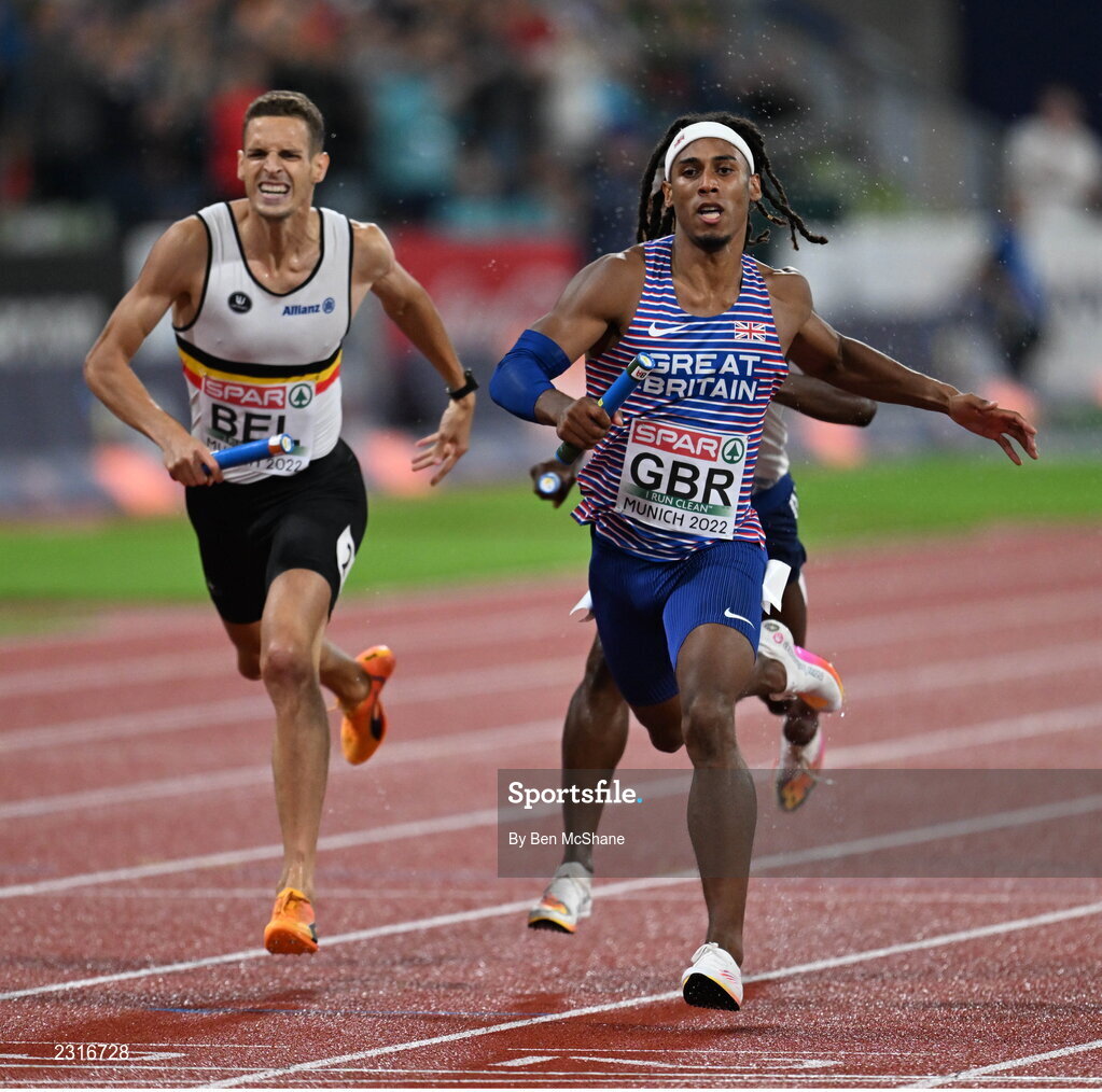 20 August 2022; Alex Haydock-Wilson of Great Britain crosses the line to win the Men's 4x400m Relay Final during day 10 of the European Championships 2022 at the Olympiastadion in Munich, Germany. Photo by Ben McShane/Sportsfile