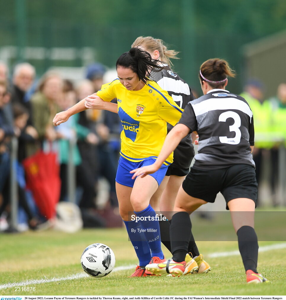 20 August 2022; Leeann Payne of Terenure Rangers is tackled by Theresa Keane, right, and Aoife Killilea of Corrib Celtic FC during the FAI Women's Intermediate Shield Final 2022 match between Terenure Rangers and Corrib Celtic FC at Leah Victoria Park in Tullamore, Offaly. Photo by Tyler Miller/Sportsfile