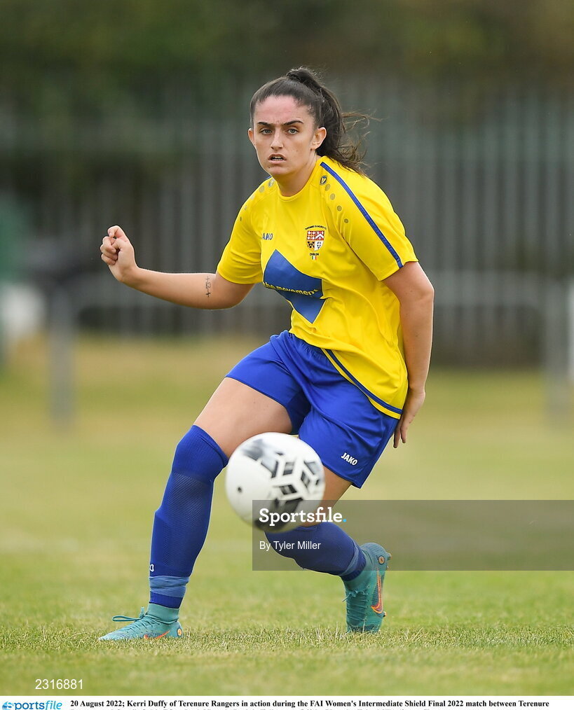 20 August 2022; Kerri Duffy of Terenure Rangers in action during the FAI Women's Intermediate Shield Final 2022 match between Terenure Rangers and Corrib Celtic FC at Leah Victoria Park in Tullamore, Offaly. Photo by Tyler Miller/Sportsfile