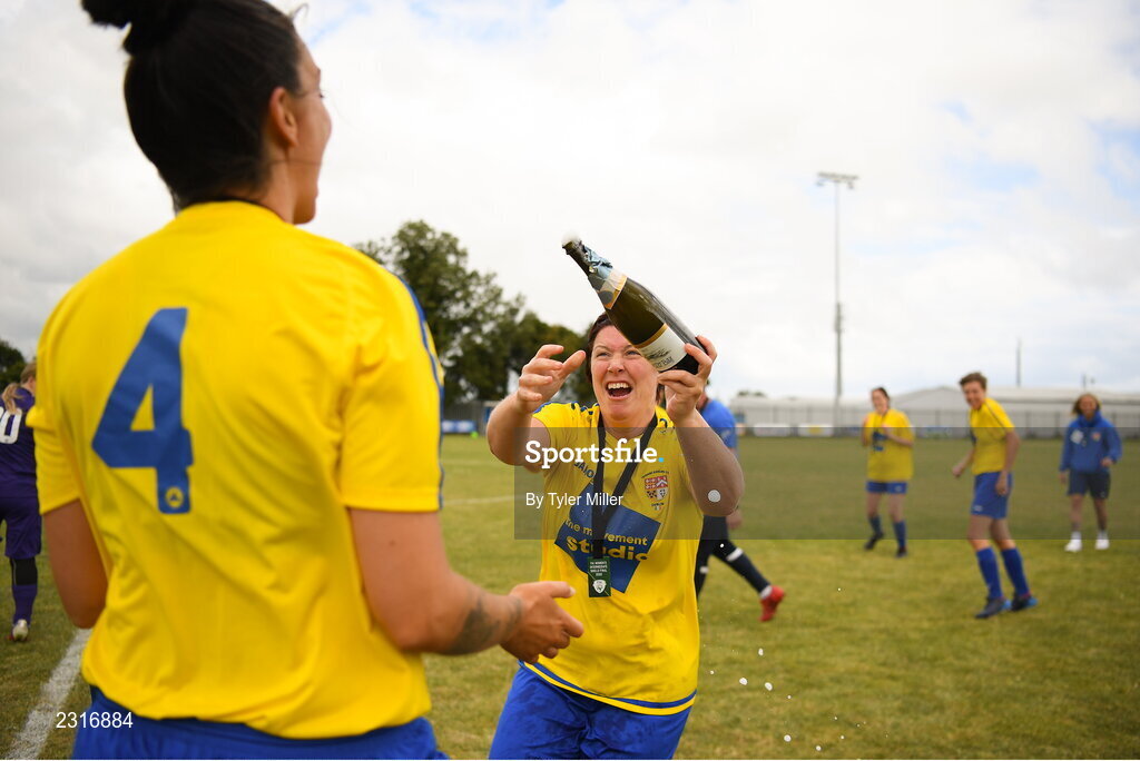 20 August 2022; Paula Hamilton, right, and Emma O'Connor of Terenure Rangers celebrate after the FAI Women's Intermediate Shield Final 2022 match between Terenure Rangers and Corrib Celtic FC at Leah Victoria Park in Tullamore, Offaly. Photo by Tyler Miller/Sportsfile
