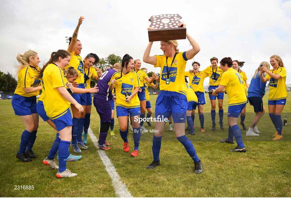 20 August 2022; The Terenure Rangers captain Ruth Comerford, and her team mates, celebrate after the FAI Women's Intermediate Shield Final 2022 match between Terenure Rangers and Corrib Celtic FC at Leah Victoria Park in Tullamore, Offaly. Photo by Tyler Miller/Sportsfile