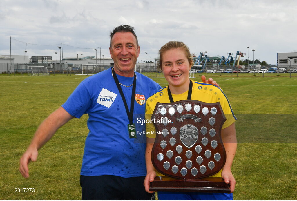 20 August 2022; Carrie Pedley of Terenure Rangers with her dad Eddie, a coach with Terenure Rangers, celebrate after the FAI Women's Intermediate Shield Final 2022 match between Terenure Rangers and Corrib Celtic FC at Leah Victoria Park in Tullamore, Offaly. Photo by Ray McManus/Sportsfile