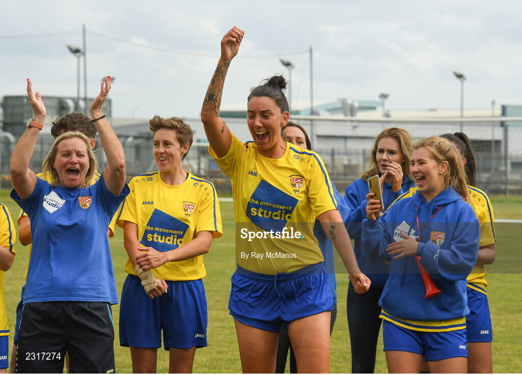 20 August 2022; Emma O'Connor of Terenure Rangers and manager Caroline Kelly, left, lead the celebrations after the FAI Women's Intermediate Shield Final 2022 match between Terenure Rangers and Corrib Celtic FC at Leah Victoria Park in Tullamore, Offaly. Photo by Ray McManus/Sportsfile