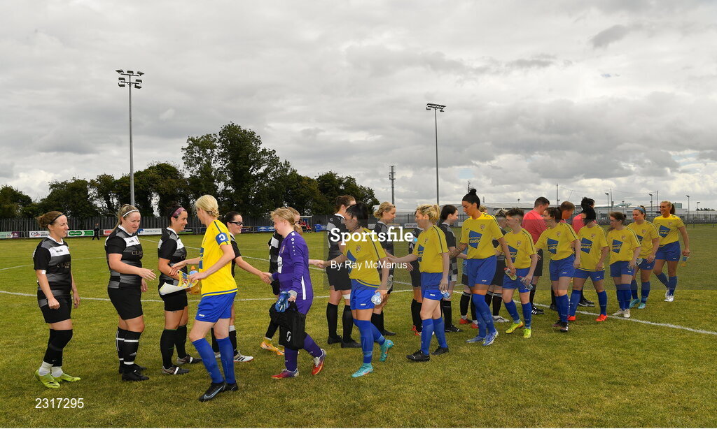 20 August 2022; Both sets of players shake hands before the FAI Women's Intermediate Shield Final 2022 match between Terenure Rangers and Corrib Celtic FC at Leah Victoria Park in Tullamore, Offaly. Photo by Ray McManus/Sportsfile