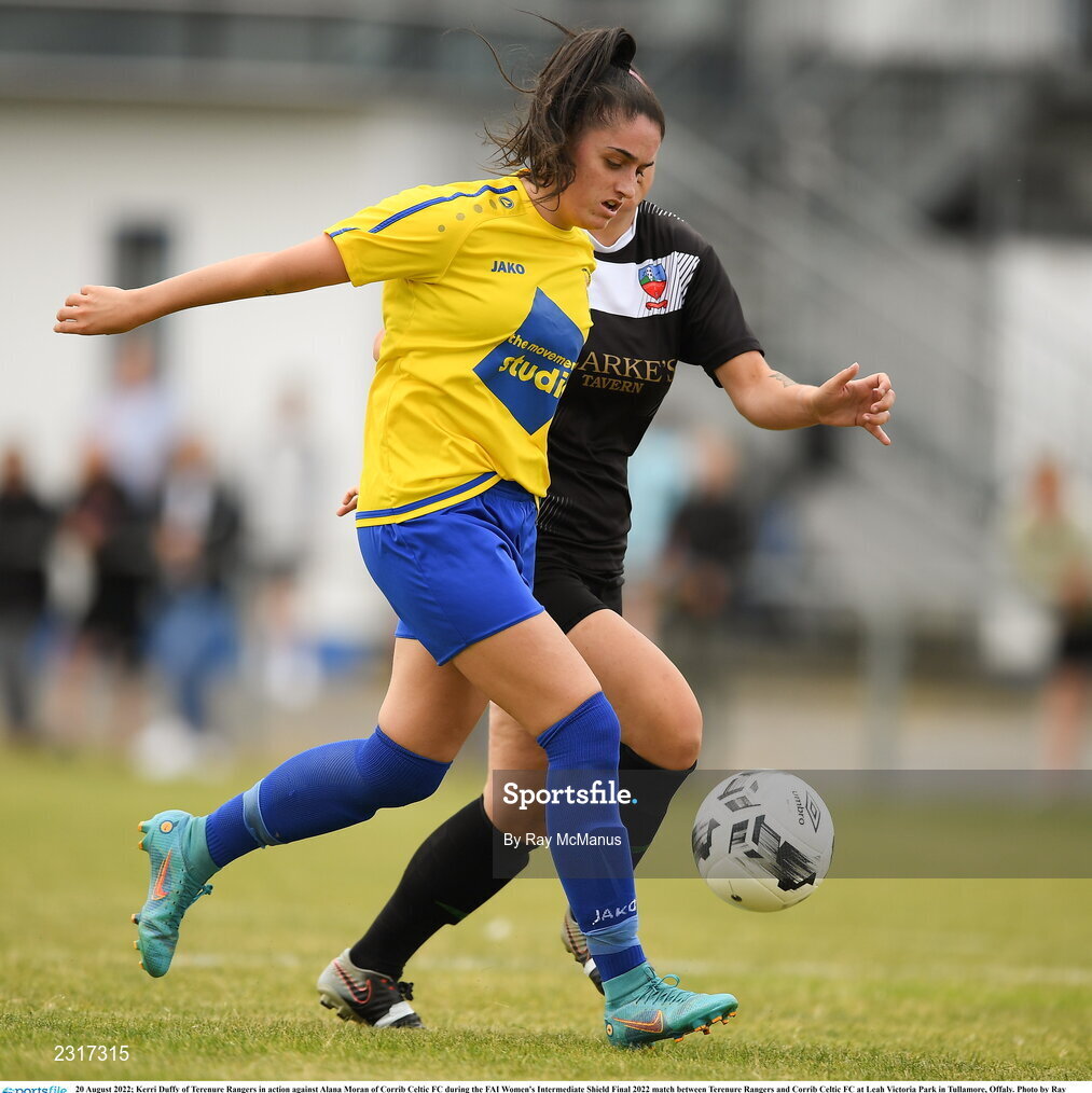 20 August 2022; Kerri Duffy of Terenure Rangers in action against Alana Moran of Corrib Celtic FC during the FAI Women's Intermediate Shield Final 2022 match between Terenure Rangers and Corrib Celtic FC at Leah Victoria Park in Tullamore, Offaly. Photo by Ray McManus/Sportsfile