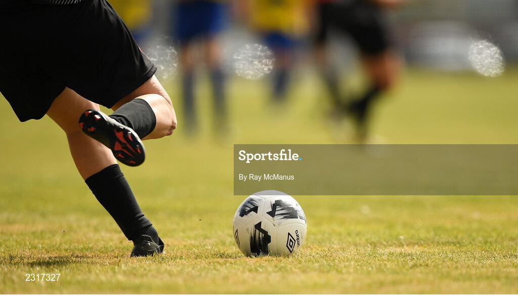 20 August 2022; A Corrib Celtic FC player takes a free during the FAI Women's Intermediate Shield Final 2022 match between Terenure Rangers and Corrib Celtic FC at Leah Victoria Park in Tullamore, Offaly. Photo by Ray McManus/Sportsfile