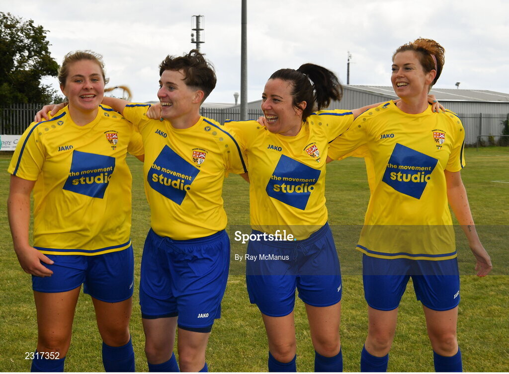 20 August 2022; Terenure Rangers players Carrie Pedley, left, Aisling Cusack, Eimear O'Herlihy and Sarah Finn, right celebrate after the FAI Women's Intermediate Shield Final 2022 match between Terenure Rangers and Corrib Celtic FC at Leah Victoria Park in Tullamore, Offaly. Photo by Ray McManus/Sportsfile