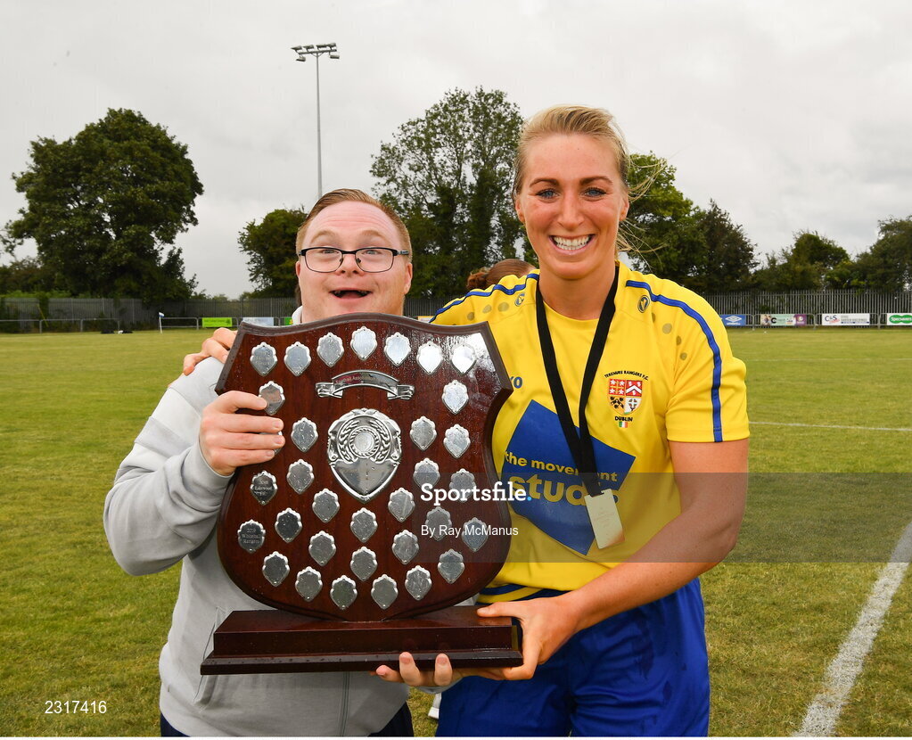 20 August 2022; Jenny Claffey of Terenure Rangers and her brother Mark celebrate after the FAI Women's Intermediate Shield Final 2022 match between Terenure Rangers and Corrib Celtic FC at Leah Victoria Park in Tullamore, Offaly. Photo by Ray McManus/Sportsfile