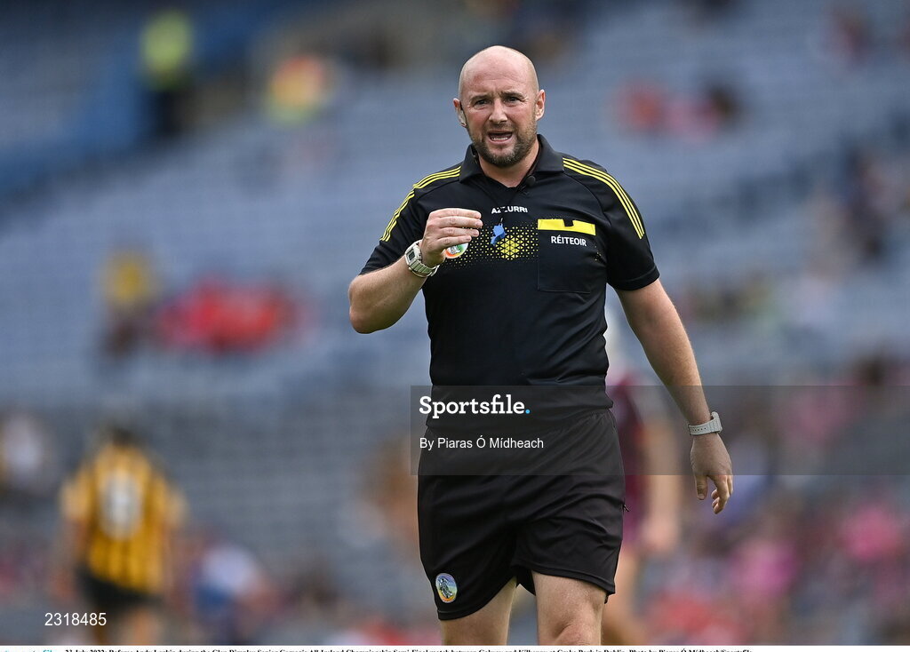 23 July 2022; Referee Andy Larkin during the Glen Dimplex Senior Camogie All-Ireland Championship Semi-Final match between Galway and Kilkenny at Croke Park in Dublin. Photo by Piaras Ó Mídheach/Sportsfile