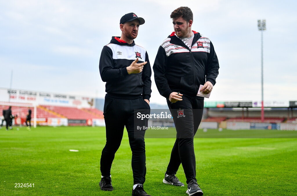 29 August 2022; Dundalk head coach Stephen O'Donnell, left, in conversation with Dundalk video analyst Dominic Corrigan before the SSE Airtricity League Premier Division match between Sligo Rovers and Dundalk at The Showgrounds in Sligo. Photo by Ben McShane/Sportsfile
