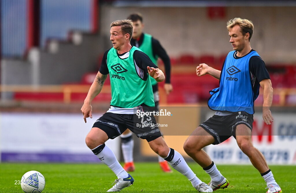 29 August 2022; John Mountney, left, and Greg Sloggett of Dundalk before the SSE Airtricity League Premier Division match between Sligo Rovers and Dundalk at The Showgrounds in Sligo. Photo by Ben McShane/Sportsfile