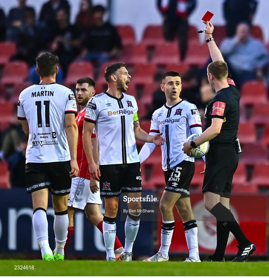 29 August 2022; Darragh Leahy of Dundalk, second from right, is shown a red card by referee John McLoughlin during the SSE Airtricity League Premier Division match between Sligo Rovers and Dundalk at The Showgrounds in Sligo. Photo by Ben McShane/Sportsfile