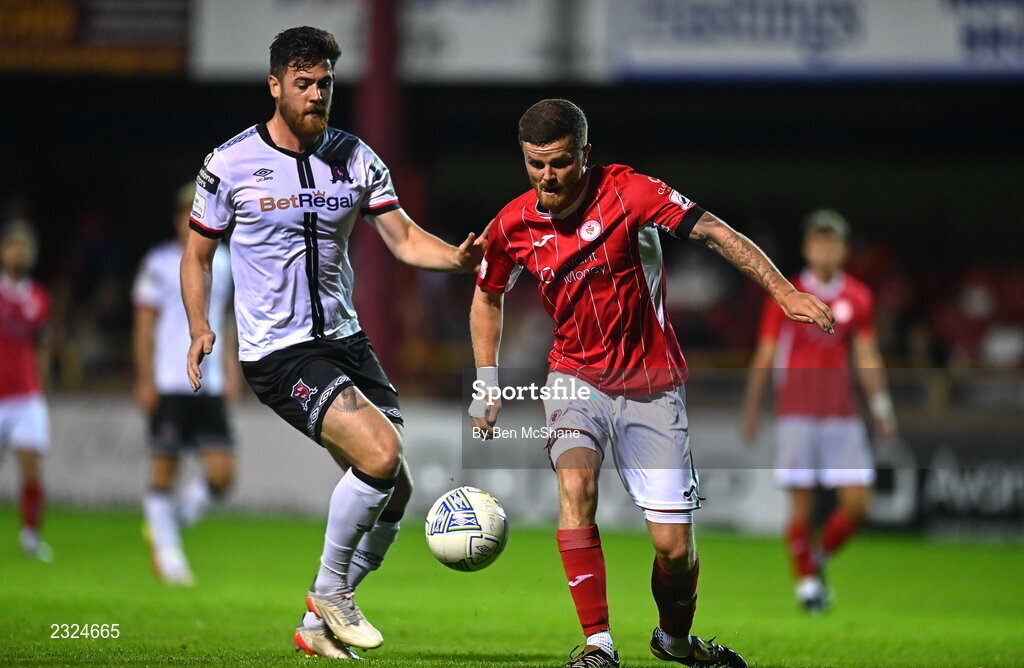 29 August 2022; Adam McDonnell of Sligo Rovers in action against Sam Bone of Dundalk during the SSE Airtricity League Premier Division match between Sligo Rovers and Dundalk at The Showgrounds in Sligo. Photo by Ben McShane/Sportsfile
