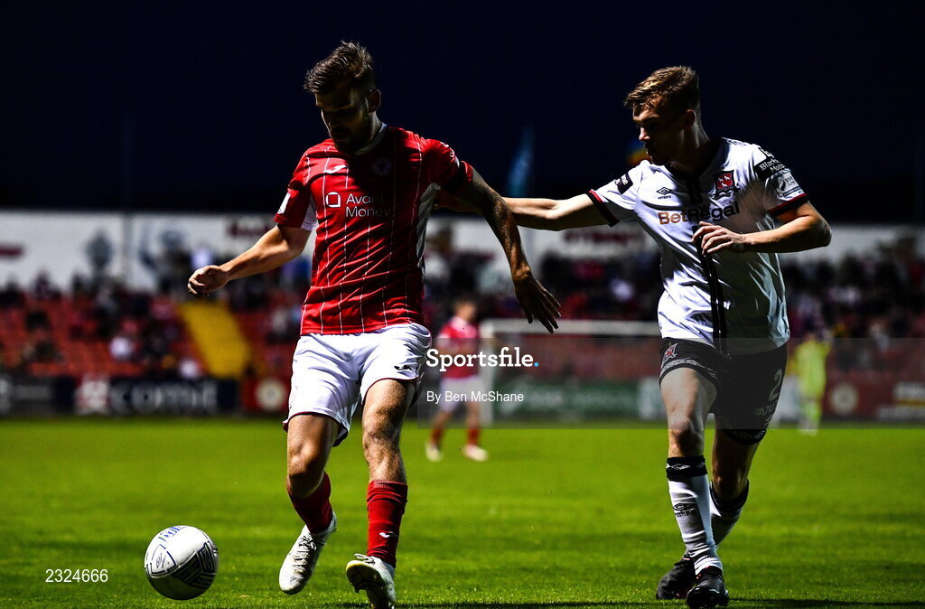 29 August 2022; Frank Liivak of Sligo Rovers in action against Lewis Macari of Dundalk during the SSE Airtricity League Premier Division match between Sligo Rovers and Dundalk at The Showgrounds in Sligo. Photo by Ben McShane/Sportsfile