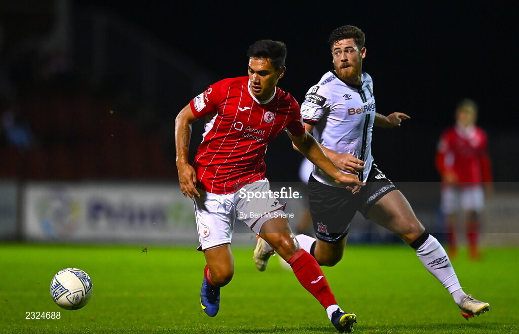 29 August 2022; Max Mata of Sligo Rovers in action against Sam Bone of Dundalk during the SSE Airtricity League Premier Division match between Sligo Rovers and Dundalk at The Showgrounds in Sligo. Photo by Ben McShane/Sportsfile
