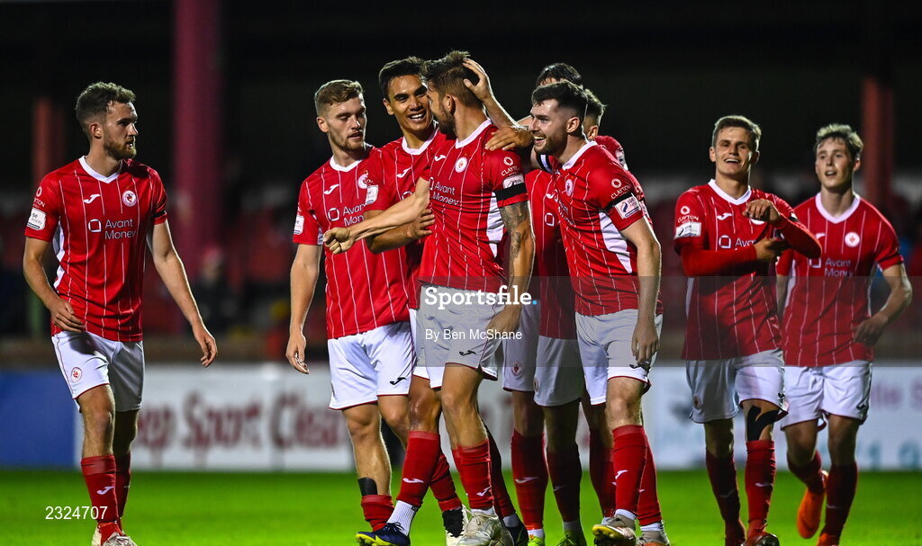 29 August 2022; Frank Liivak of Sligo Rovers, centre, celebrates with his teammates after scoring their side's second goal during the SSE Airtricity League Premier Division match between Sligo Rovers and Dundalk at The Showgrounds in Sligo. Photo by Ben McShane/Sportsfile